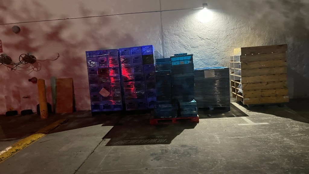 Sure enough, this stack of milk crates behind a Kroger has a handwritten warning sign attached to the shrink wrap.