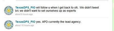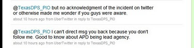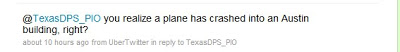 Today was a tragic day in Austin. Several agencies from the local, federal, and state levels are all working to get a clear picture of what happened. While the chaos was in full throttle at the crash site, national news organizations were starting to pick up the story from the local outlets. The website twitter was buzzing with the latest updates. Even the NTSB jumped in with a few small notes. Today also happened to be the appointed time the state’s public safety commission got together. The director and other staffers from the Department of Public Safety were at that meeting. Take a look at snippets from my twitter feed below to see why I’m a little frustrated.