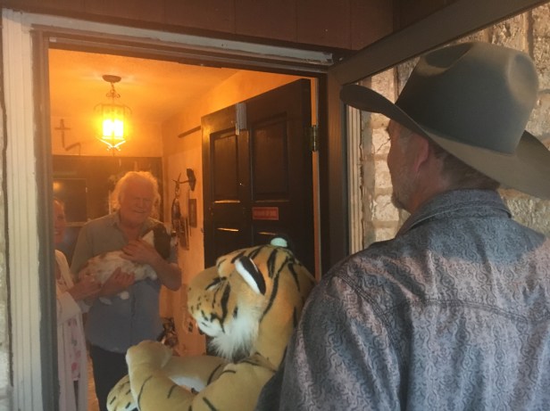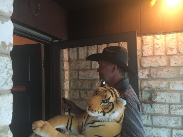 Just before we left, Shaver handed John a large stuffed tiger to take with him. This toy was on the couch and what made it more hilarious was that John and Alicia live in Louisiana now: LSU Tiger country.