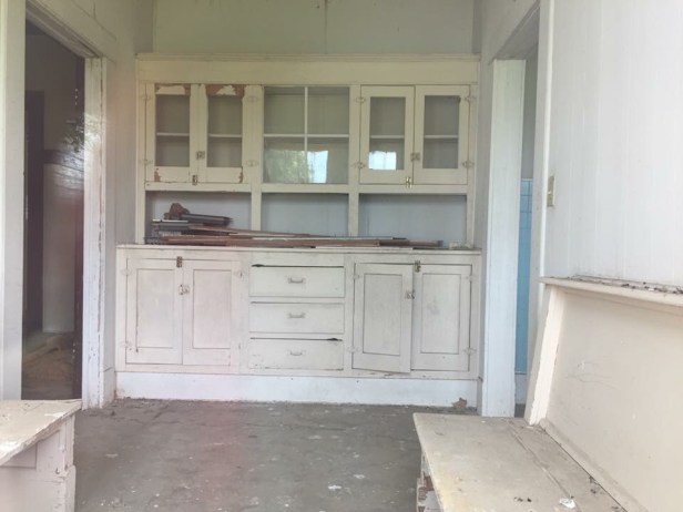A door to the right, entered a room that was added on at some point. It was a bedroom, with a bath. The door to the west, led to the breakfast room….with its built-in three-sided booth under a large window, on the right. A “butler’s pantry” filled the left wall. Glass doors covered shelves above a cabinet with drawers for linens and dinnerware.