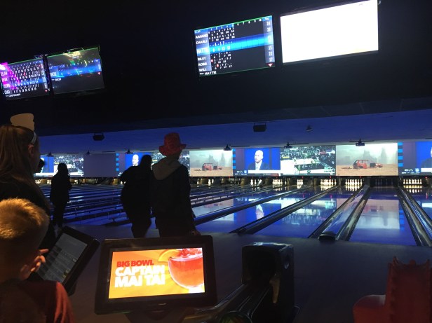 If you haven’t been lately, you’ll be surprised to learn that you can watch TV while attempting to hit a strike or a spare. Actually you can watch a lot of TV. Each lane has its own screen above the pins. We watched the Texas Aggies beat UNC in the Gator Bowl.