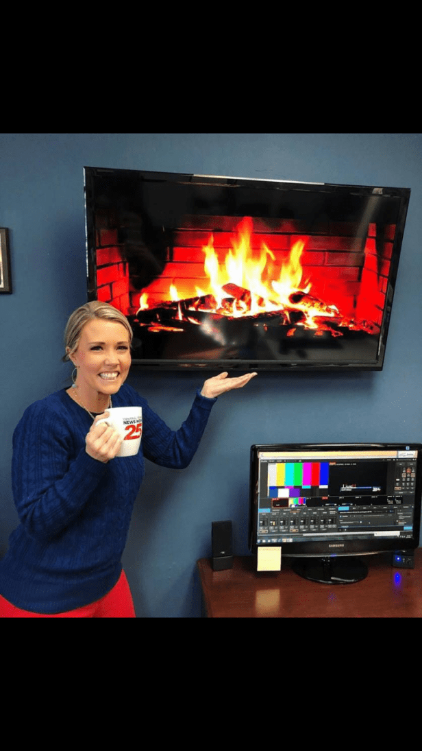 Thanks to YouTube, we “built” a fire in the office “fireplace” this week. Anchor Lindsay Liepman is seen here showing off the nice workplace addition.