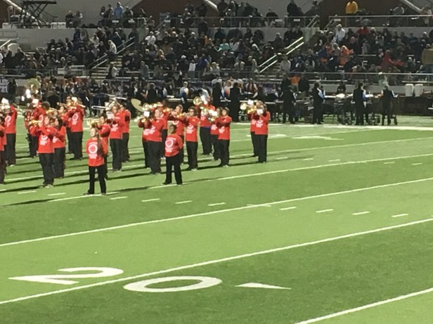 When the high school football team survives the playoffs, that means the band gets to keep marching at halftime. Their season’s not over yet. This is Mansfield, Texas and one of those trumpet players down there on the field belongs to me. I don’t know that I’ve seen a happier child than this one thanks to the marching band.