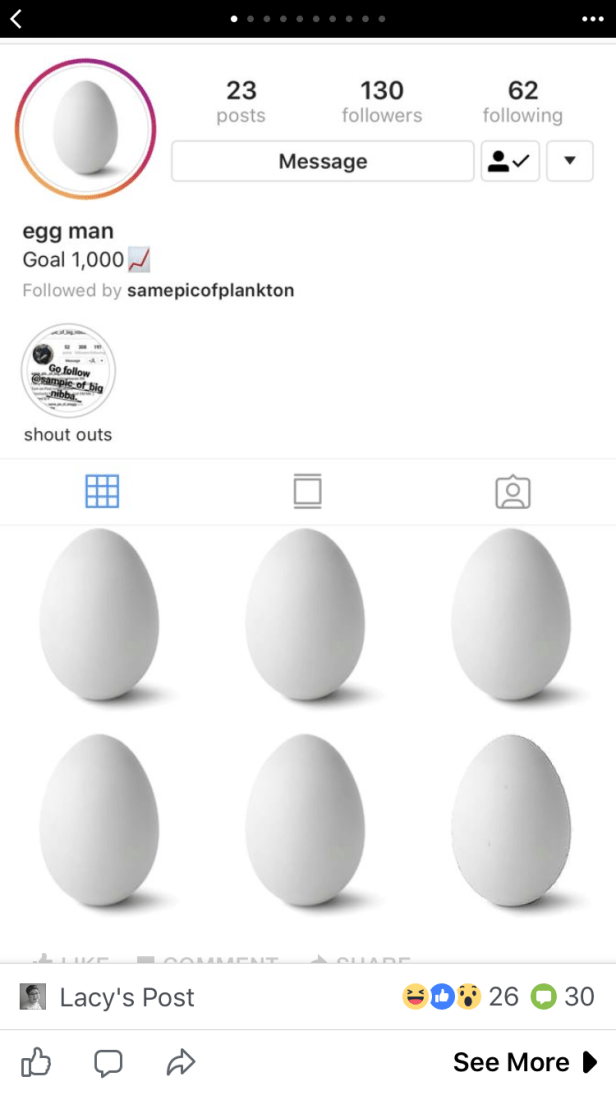 This one of an egg has 130 followers. The egg man’s goal is to get 1,000 people to follow his daily habit.
