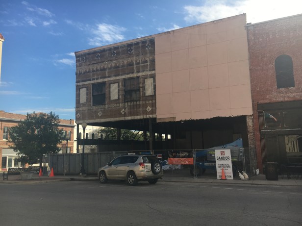 As seen in downtown Temple, Texas yesterday. Workers have gutted the first floor of an old building, but the fascinating part is up above. Tons of stucco Nd rebar are being removed to reveal the original facade.